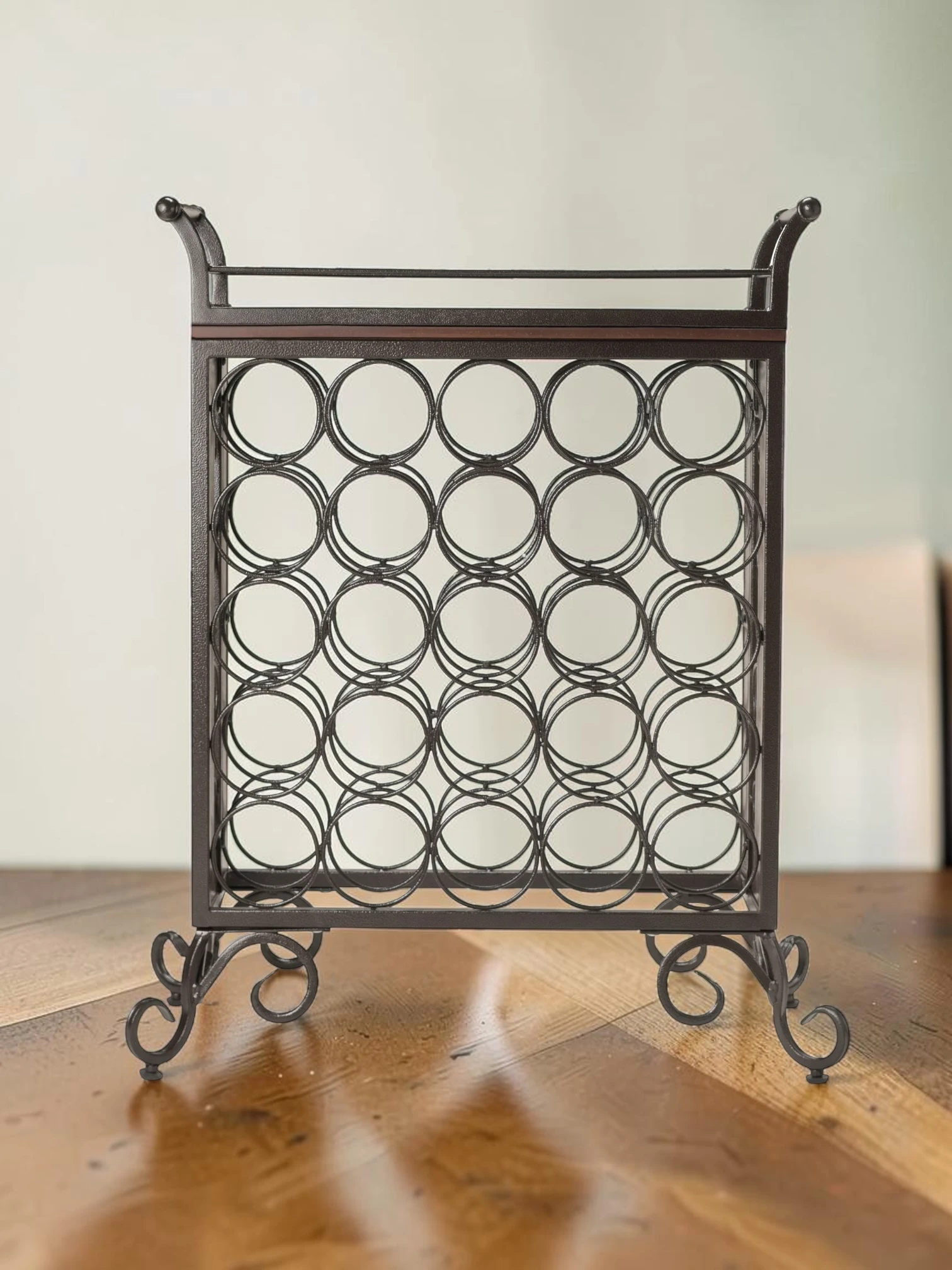 Elevate your home wine storage with this versatile 25-bottle wine rack, designed to blend industrial durability with rustic elegance. Crafted from a robust metal frame with a rich antique bronze finish and accented with high-quality composite wood, this piece serves as both a functional storage solution and a stylish centerpiece for your dining room or kitchen.