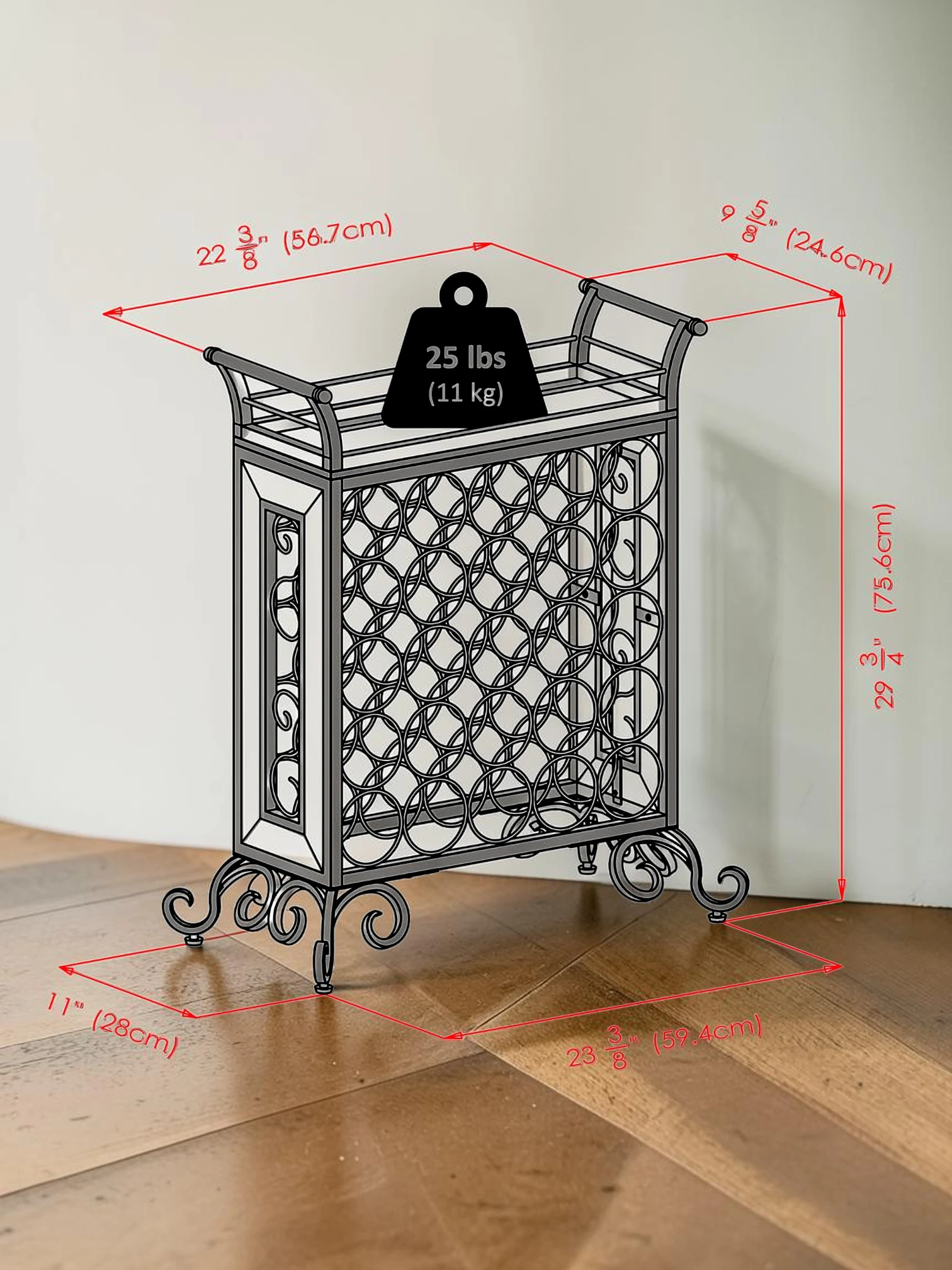 • Total Capacity: 25 Standard Wine Bottles (3.5″ diameter per slot).